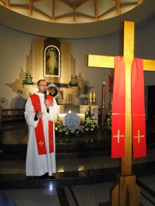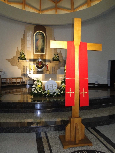 W czwartym dniu naszych rekolekcji wpatrywaliśmy się w Jezusa Chrystusa, który jest jedynym Panem i Zbawicielem człowieka. Ks. Rekolekcjonista zachęcał nas, byśmy otworzyli nasze serca na Jego obecność, na Jego panowanie, królowanie, na moc świętego Imienia JEZUS i na tajemnicę KRZYŻA. W centrum dzisiejszych rozważań znalazła się Eucharystia i tajemnica Krzyża, która dokonuje się w każdej Eucharystii. Do naszych serc, oczyszczonych wczoraj w sakramencie pokuty, zaprosiliśmy Jezusa uznając Go za jedynego Pana i Zbawiciela. Podczas wieczornego nabożeństwa każdy mógł podejść do Krzyża, dotknąć go i ucałować święte drzewo, na którym „zawisło zbawienie świata”.