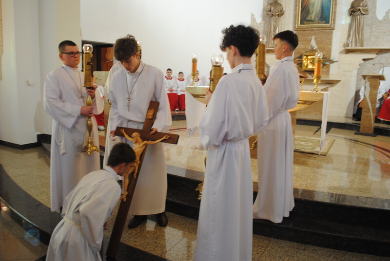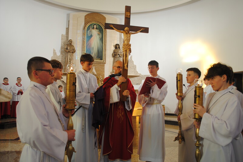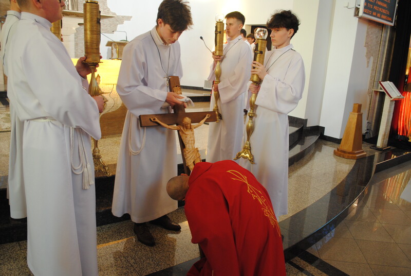 Liturgia Słowa: W jej centrum znalazł się opis Męki Pańskiej według św. Jana, odczytany z podziałem na role, co pozwoliło nam na nowo przeżyć dramatyczne wydarzenia z Golgoty.